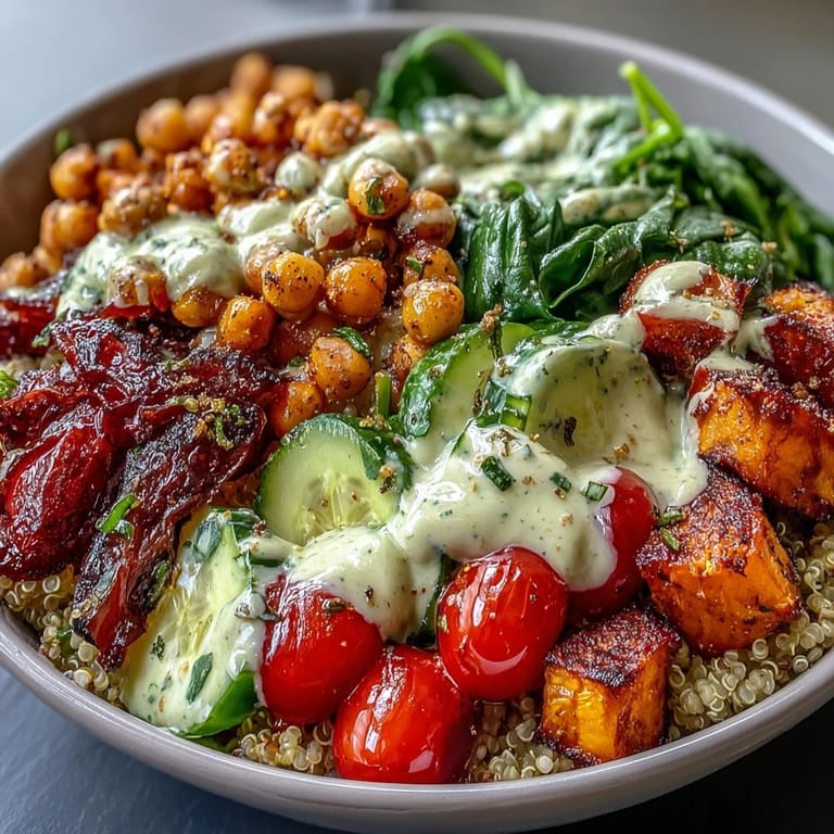The genius of a well-built Buddha bowl is that it satisfies multiple cravings at once—you get creaminess from the tahini and avocado, crunch from the chickpeas and vegetables, earthiness from the quinoa, and just enough bright acidity to keep everything from feeling heavy. What makes this one specifically work is that the warm components soften just enough while staying distinct, and the dressing acts as a glue that brings all those separate flavors into conversation with each other. I've made versions with different grains and different vegetables, but this core formula—roasted starch, roasted protein, fresh vegetables, creamy dressing—is undefeatable.