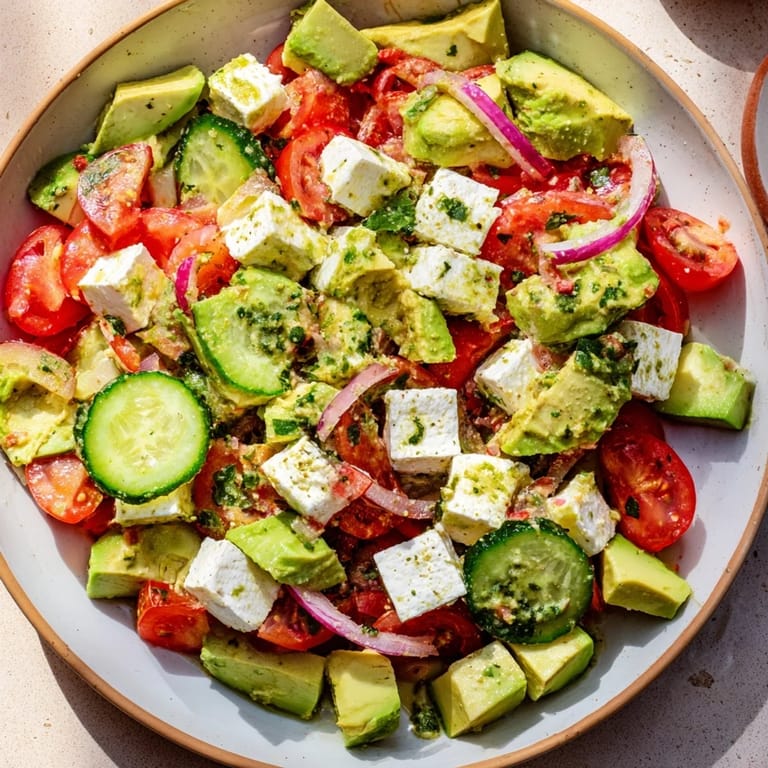 Save A vibrant, refreshing salad bursting with juicy tomatoes, crisp cucumber, creamy avocado, and tangy feta, dressed in a light lemon-olive oil vinaigrette. Perfect as a side or light main.