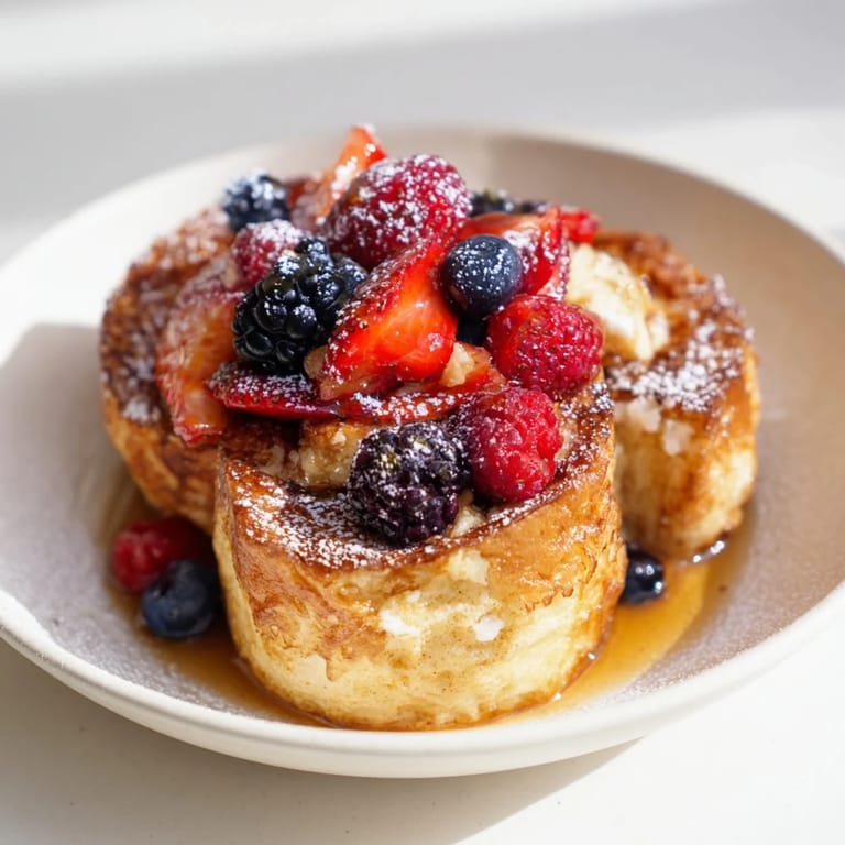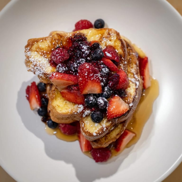- Arrange French toast slices on plates. Top generously with fresh berries, drizzle with maple syrup, and dust with powdered sugar if desired.