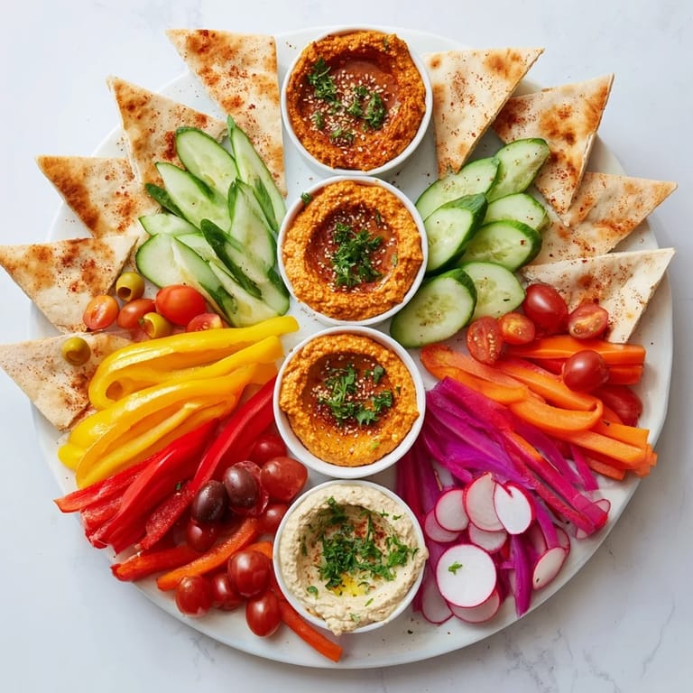 Each of the three dips brings something different to the table: hummus is creamy and neutral, letting vegetables shine; muhammara is bold and nutty, demanding to be tasted slowly; baba ganoush is smoky and complex, the kind of flavor that makes people pause mid-bite. The vegetables aren't just vehicles—their sweetness (carrots, tomatoes), sharpness (radish, red onion), and freshness (cucumber, peppers) interact with each dip differently. Some guests will stick with one favorite pairing; others will experiment through the whole platter like it's a flavor map. Both ways are correct.