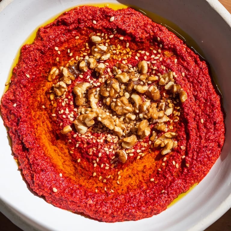 Save I first tasted muhammara at a sprawling family dinner in Beirut, where it arrived in a shallow ceramic bowl with a glossy swirl of olive oil on top, flecked with pomegranate seeds that caught the evening light. The moment I dipped warm pita into that vibrant red dip, something clicked—the walnuts gave it a subtle earthiness, the pomegranate molasses added a bright tang that made my mouth wake up, and there was this deep smokiness that suggested flame had kissed those peppers. Now when I make it at home, the kitchen fills with that same roasted pepper perfume, and suddenly people gather around before anything else is ready.
