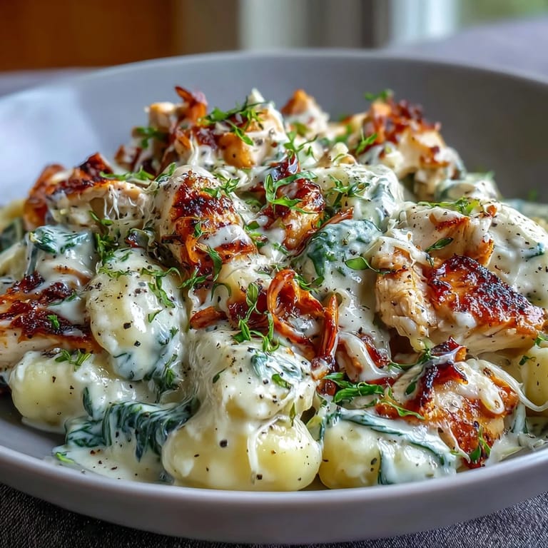 Save There's something about the way gnocchi pillows absorb cream that makes a Tuesday night feel like a celebration. I stumbled onto this combination while standing in my kitchen on a rainy afternoon, staring at a box of gnocchi and wondering if chicken could work in something this silky and indulgent. It absolutely could, and now I make it whenever I need comfort without the fuss. The spinach sneaks in so quietly you barely notice it's there, but it transforms the whole dish into something that actually feels balanced.