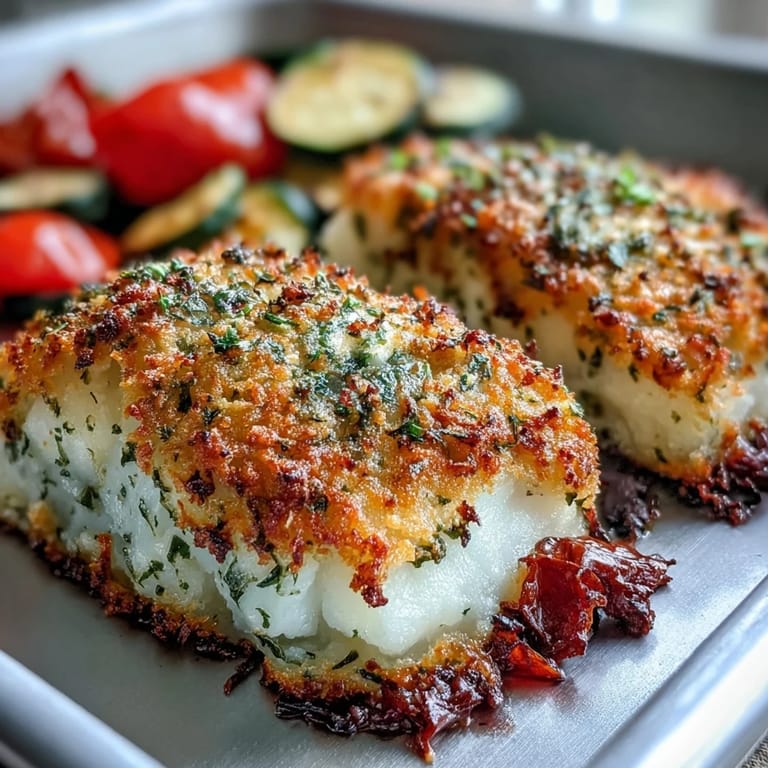 Save My neighbor stopped by on a Tuesday evening asking what smelled so incredible, and I realized I'd been so focused on getting dinner ready that I hadn't noticed how the aroma of toasted panko and melting cheese had drifted right out the kitchen window. That's when I knew this sheet pan fish had something special—it looked elegant enough for company but came together so quickly I could barely believe it. The crispy crust catches the light like golden armor around tender cod, while the vegetables soften and caramelize just enough to taste like pure comfort.